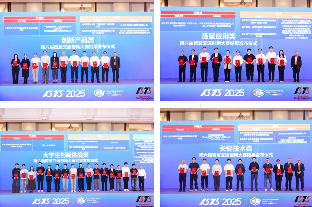 同时,大会开幕式现场隆重发布了第六届智慧交通创新大赛的决赛结果,对脱颖而出的优秀创新产品和团队进行了表彰,充分展现了智慧交通领域蓬勃发展的创新力量和“产学研用”紧密衔接的良好生态。本届大赛共收到163项参赛作品,涵盖创新产品、关键技术、场景应用与大学生创新赛四大类别。中国公路学会交通工程与信息化分会理事长杨春晖宣读获奖名单,张喜刚、曼达洛齐斯、杨春晖与王太等嘉宾为获奖团队颁发荣誉证书。