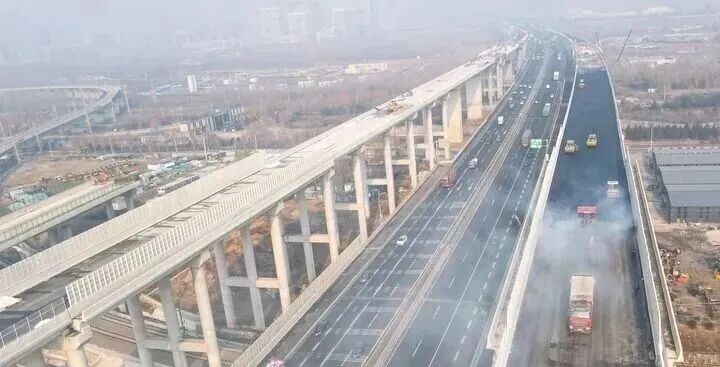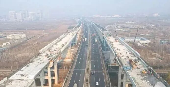 12月16日,在京台高速公路齐河至济南段改扩建工程项目现场,跨京沪三、四号线两座涉铁立交桥成功完成转体后,已与南北两侧在建高架路段实现对接,高架长龙南北横亘,桥面施工如火如荼,沥青路面摊铺及交通标识线施划在有序推进。