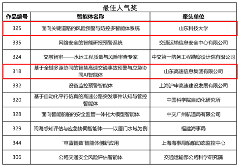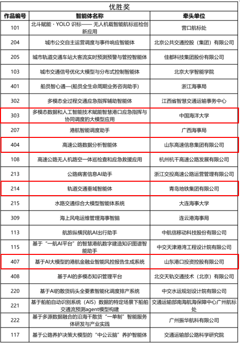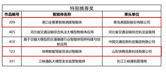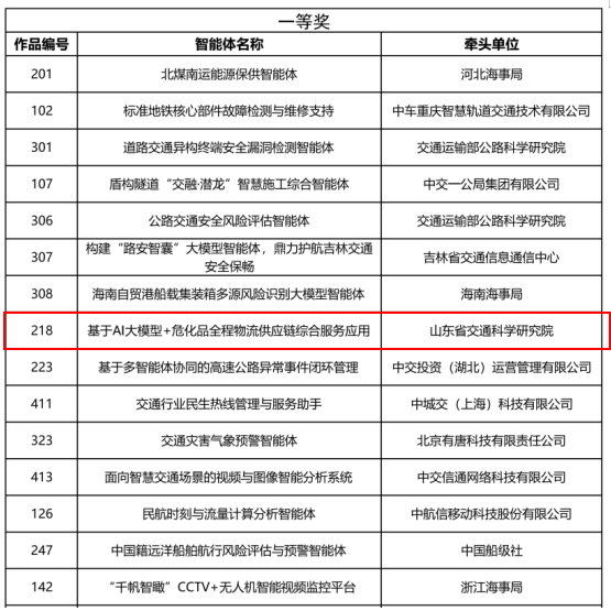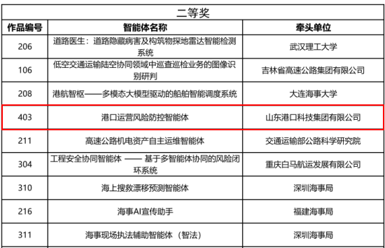 经现场答辩、专家提问等环节,由山东省交通运输厅联合山东综合交通数据运营中心、山东省港口集团有限公司、山东港口陆海国际物流集团有限公司、山东省数智交通科技有限公司等单位,围绕公路水路基础设施数字化转型升级,依托自研“堑驰”综合交通多模态大模型和“天驷”智能体中台打造的“基于AI大模型+危化品全程物流供应链综合服务应用”智能体荣获大赛一等奖。