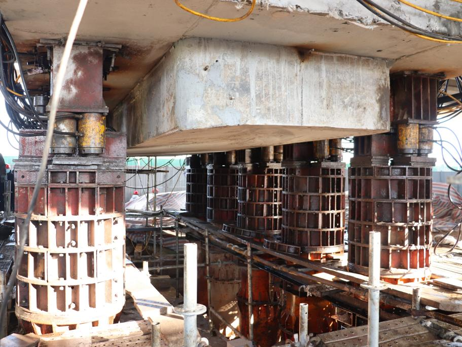 本次观摩会聚焦工业北路快速路东延主线高架桥工程。项目起点处,一段原高架下坡桥段,正通过先进的顶升移位技术获得“新生”。该段采用五跨两段整体顶升方案,在精密液压系统的控制下,正以毫米级精度平稳抬升。这不仅是桥体高度的物理改变,更是对城市既有桥梁资源高效利用与功能升级的一次生动实践。