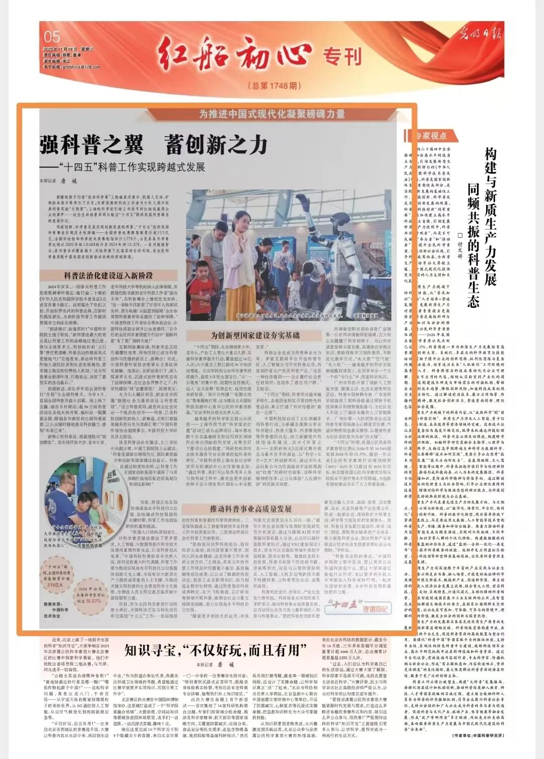科技创新、科学普及是实现创新发展的两翼。“十四五”期间我国科普事业实现历史性跨越——全国科普经费筹集额累计超215亿元,全国科技馆和科学技术类博物馆共计1779个,公民具备科学素质比例从2020年的10.56%跃升至2024年的15.37%。一系列数据背后,是科普活动覆盖城乡、科技资源下沉基层的生动实践,是全民科学素质提升服务国家创新驱动战略的深刻体现。