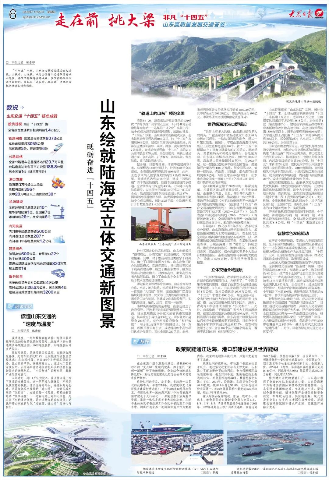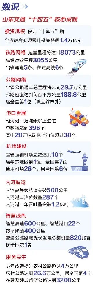 “十四五”以来,山东全力推动交通运输大建设、大提升、大发展,成为全国首个交通强国省域示范区,各项工作取得重要成效,多项重要指标位居全国前列,为扛牢“走在前、挑大梁”使命担当提供坚强支撑和保障。