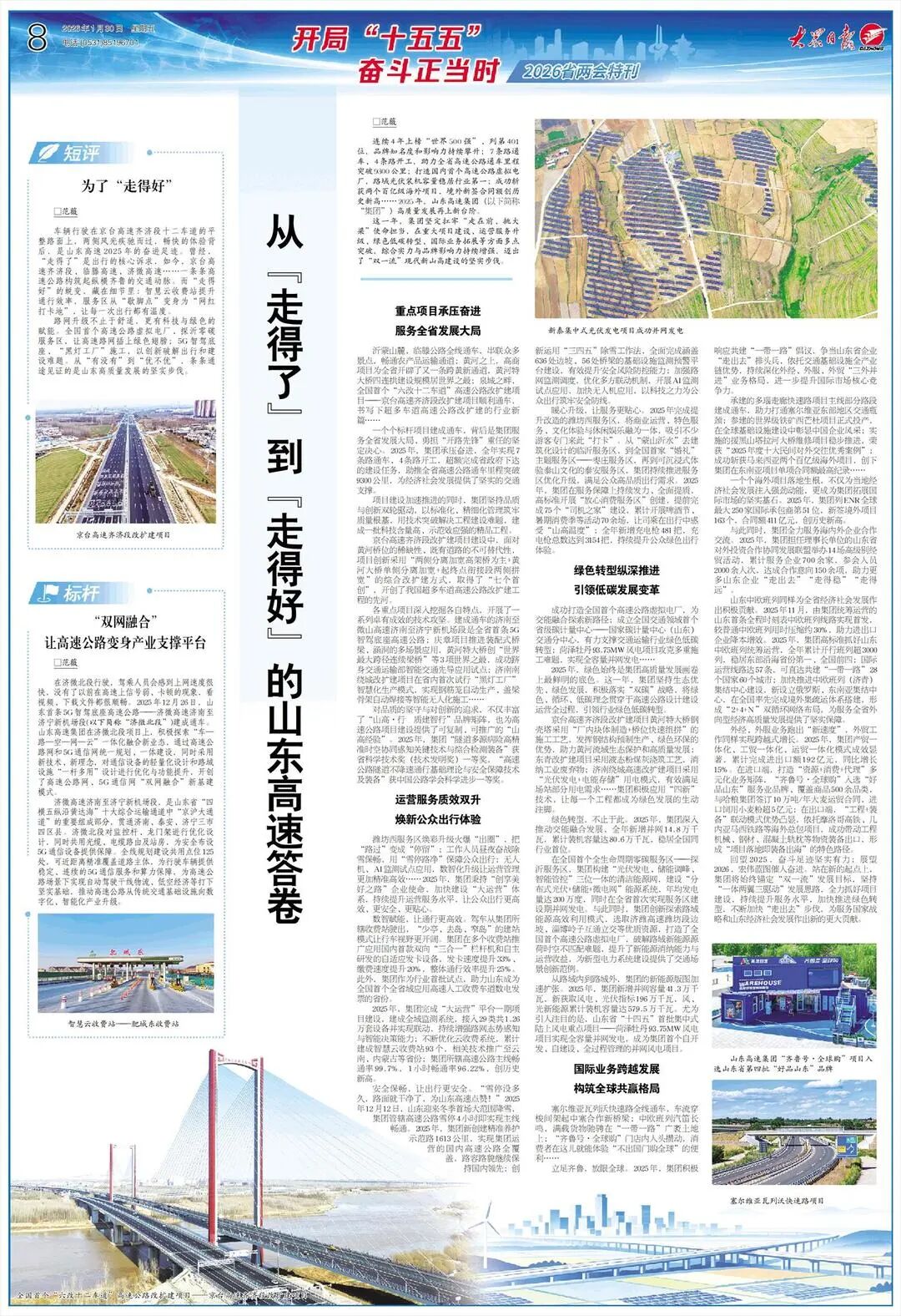 连续4年上榜“世界500强”、列第401位,品牌知名度和影响力持续攀升;7条路通车、4条路开工,助力全省高速公路通车里程突破9300公里;打造国内首个高速公路虚拟电厂,路域光伏装机容量稳居行业第一;成功斩获两个百亿级海外项目,境外新签合同额创历史新高……2025年,山东高速集团(以下简称“集团”)高质量发展再上新台阶。
