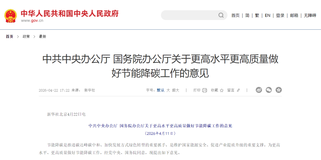 4月22日,中国政府网发布《中共中央办公厅 国务院办公厅关于更高水平更高质量做好节能降碳工作的意见》(简称《意见》)。